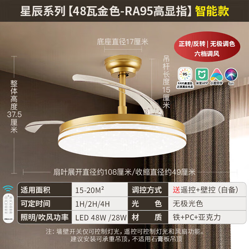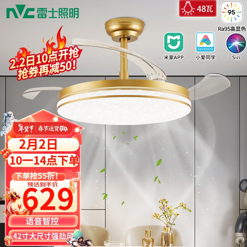雷士(NVC)吊扇灯语音app智控风扇灯客厅餐厅无极调光调色轻奢金色42寸48瓦价格:1131.00元!