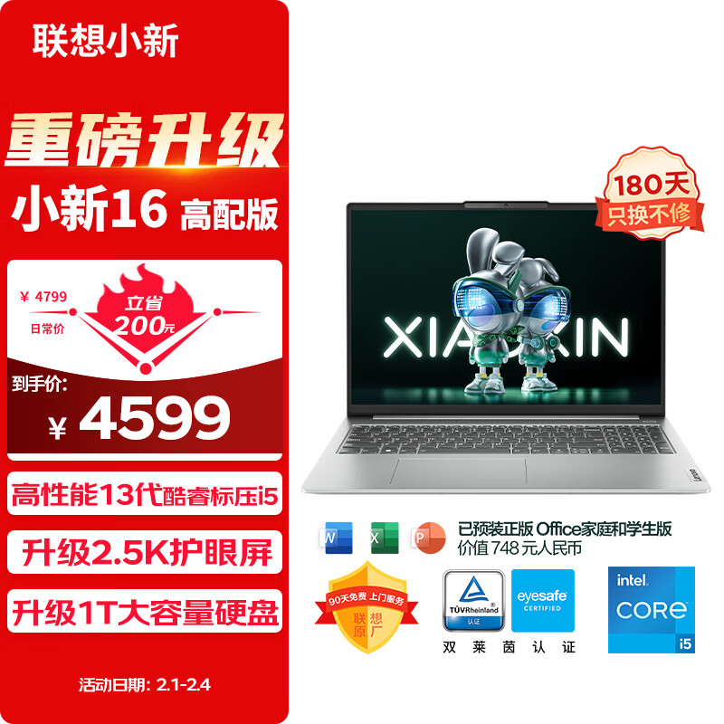 联想笔记本电脑小新16轻薄本 13代英特尔酷睿i5 16英寸超薄本(标压i5-13500H 16G 1T 16:10 2.5K)灰价格:4599.00元!