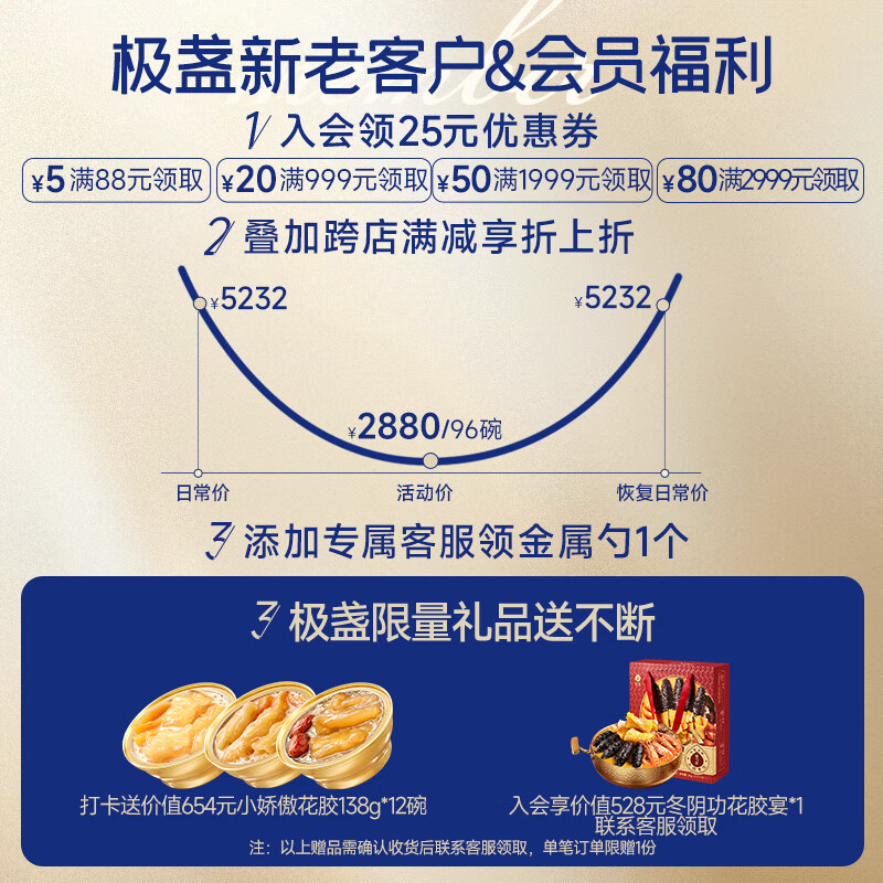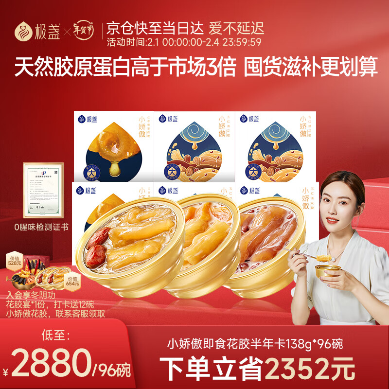 极盏小娇傲即食花胶半年卡套餐138g*96碗 天然胶原蛋白营养品 送礼长辈父母亲人月子孕妇滋补品 联系客服价格:5232.00元!