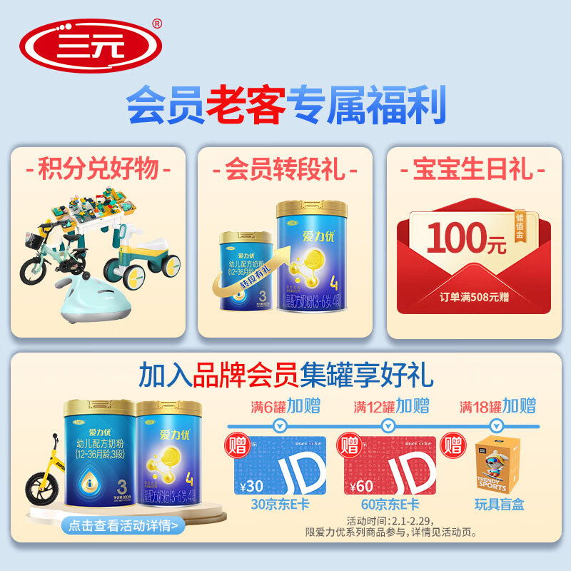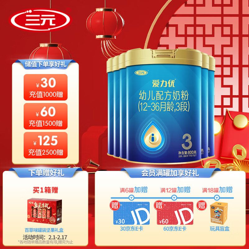 三元 爱力优幼儿配方奶粉3段(12-36个月)整箱装(800克*6罐)价格:2010.00元!