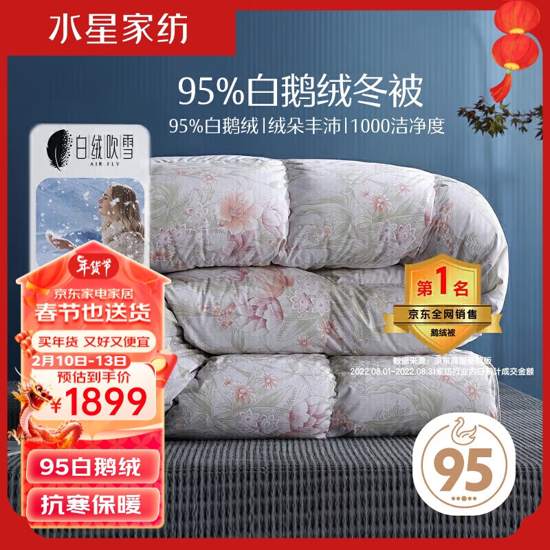水星家纺白绒吹雪抗菌95%白鹅绒羽绒被冬被(1000g填充)200*230cm价格:2299.00元!