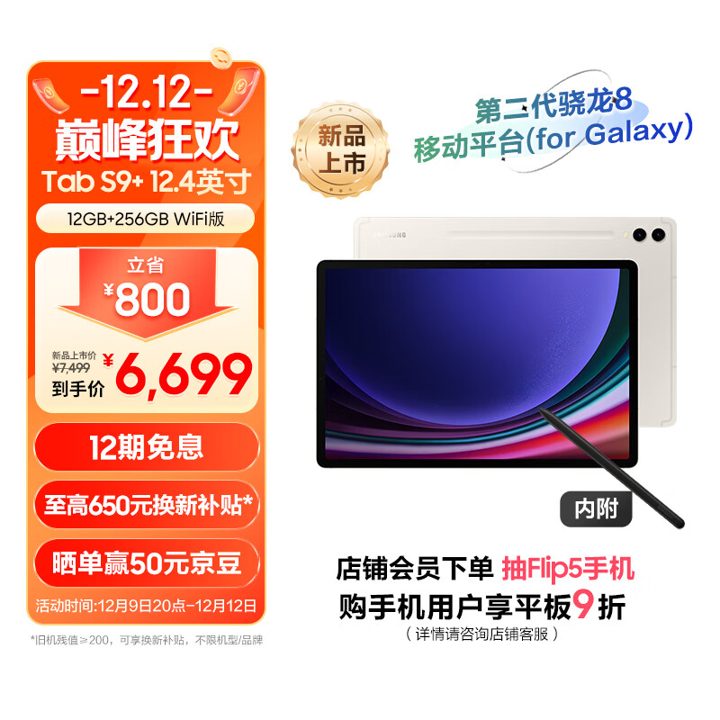 三星(SAMSUNG)平板电脑2023款Tab S9+ 12.4英寸12G+256G WIFI 骁龙8Gen2 顺滑全视屏 内附Spen 云雾金价格:6699.00元!