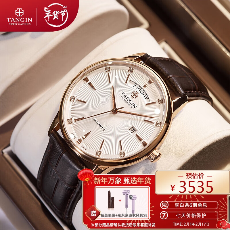 天珺(TANGIN)瑞士手表男 机械男士手表时尚皮带瑞表送男友 T7025GHWFSB价格:4135.00元!