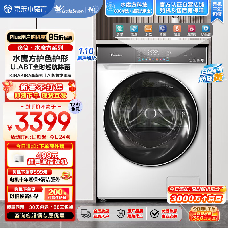 小天鹅(LittleSwan)滚筒洗衣机全自动 10KG大容量超薄白色防变色 水魔方冷水洗 1.1洗净比 彩屏智投除菌 TG100VC806W价格:3399.00元!