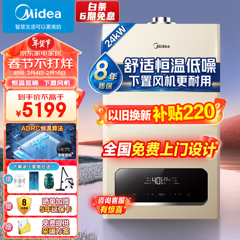 美的(Midea)双变频省气 一级低噪 舒适恒温燃气壁挂炉 天然气供暖 采暖地暖 家用锅炉省气 下置风机L1GB24-R05价格:5199.00元!