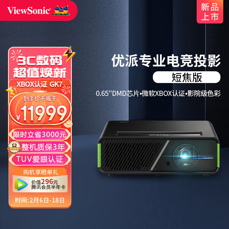 优派GK7 投影仪4K家用 短焦投影机 家庭影院 手机投影 智能电视(微软Xbox认证 0.65DMD TUV护眼认证)价格:14999.00元!
