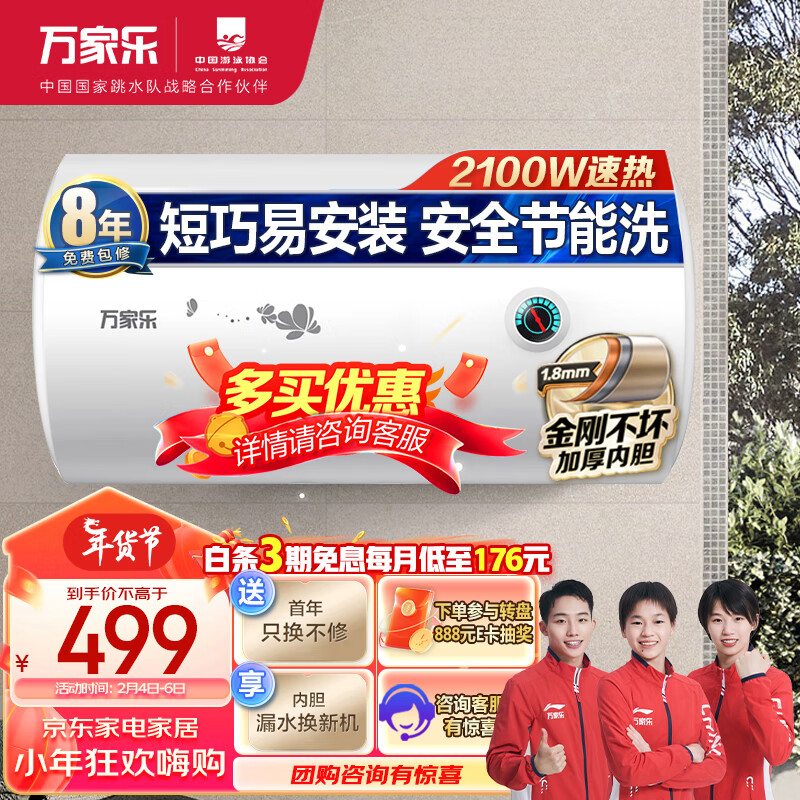 万家乐 50升家用电热水器 2100W速热 加长防电墙 经济节能 抗腐耐用小巧易操控D50-H111B价格:499.00元!