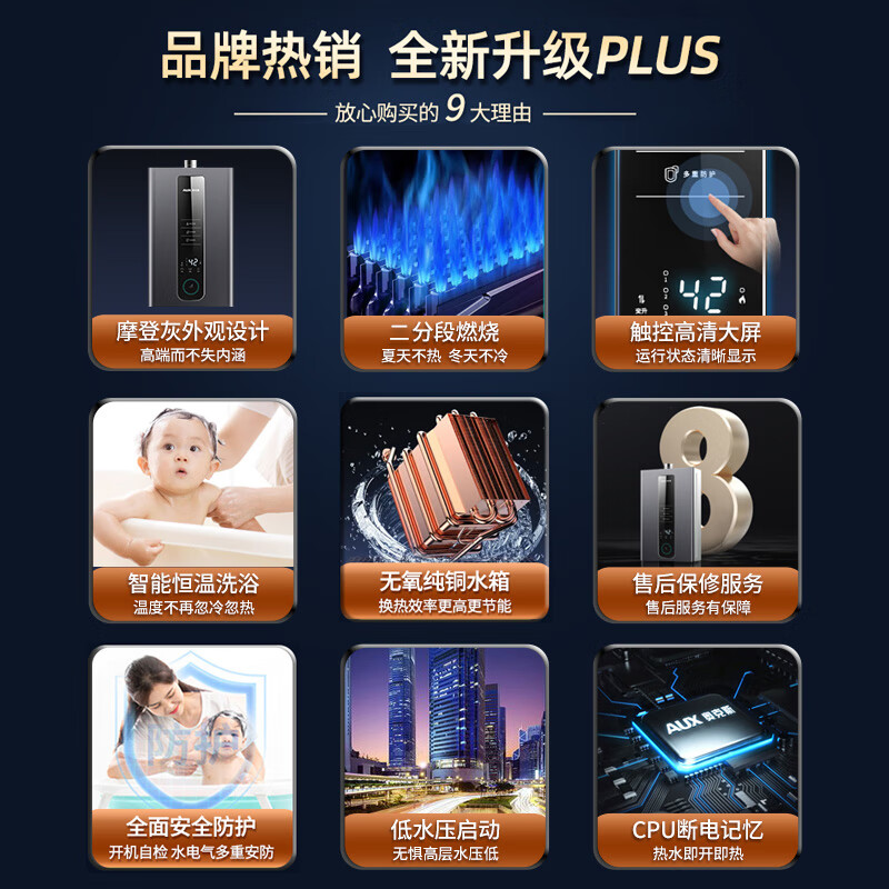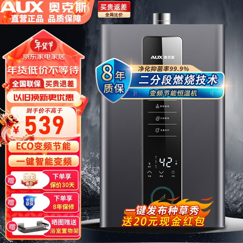 奥克斯燃气热水器 天然气12升家用强排式变频恒温速热 节能省气浴室公寓卫生间二分段燃烧 自行安装 DA76价格:539.00元!