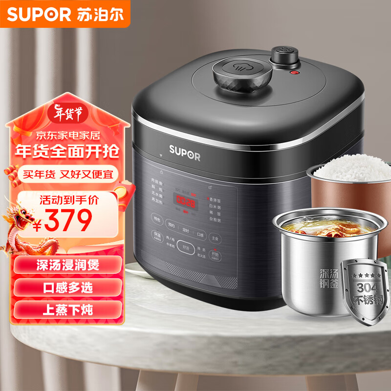 苏泊尔(SUPOR)深汤系列电锅5L家用智能预约蒸笼上蒸下煮大屏面板不锈钢厚釜煲汤SY-50FC8708双胆高压锅3-6人价格:489.00元!
