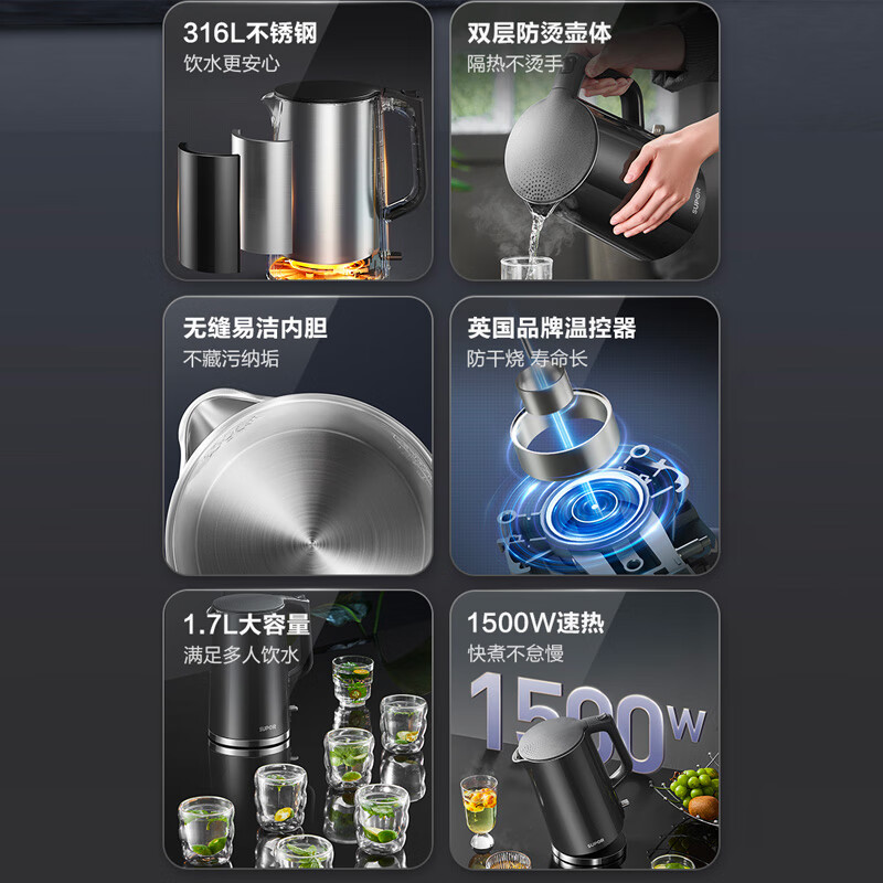 苏泊尔(SUPOR)电水壶热水壶 1.7L全钢无缝内胆 双层防烫电热水壶 316L不锈钢烧水壶 SW-17J416L价格:98.00元!