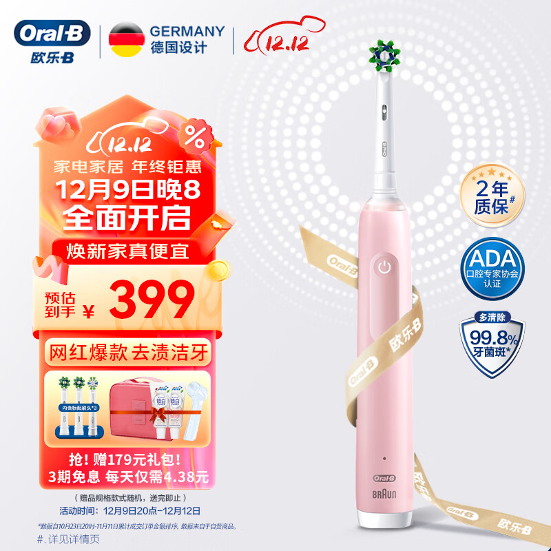 欧乐B成人电动牙刷成人Pro4Ultra小白刷3D声波圆头Pro系列深度清洁牙龈按摩生日礼物圣诞礼物新年礼物价格:459.00元!