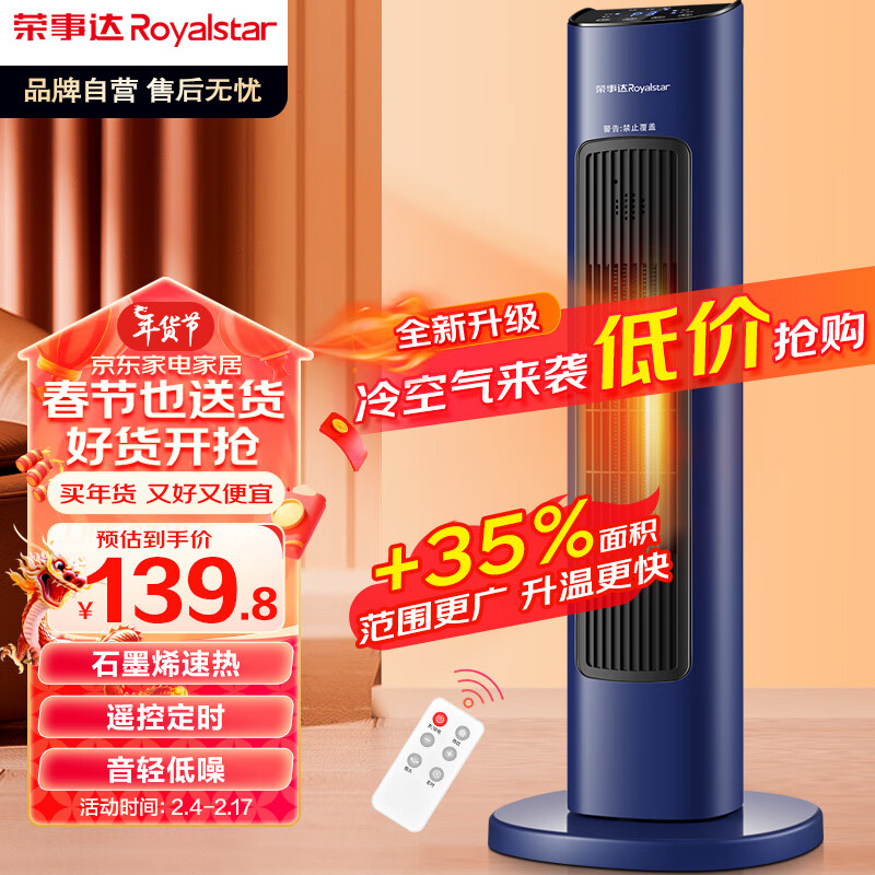 荣事达(Royalstar)""石墨烯""取暖器家用塔式暖风机电暖器遥控立式可摇头电暖气冷暖两用 NTC-2058D价格:179.90元!