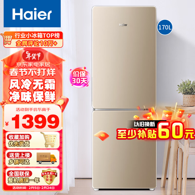 海尔(Haier)170升冰箱双开门 风冷无霜净味保鲜小型两门小冰箱 深冷速冻家用宿舍寝室出租房用电冰箱价格:1399.00元!