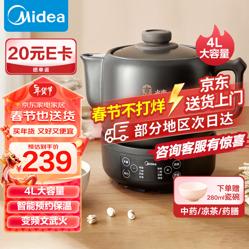 美的(Midea)煎药壶 全自动 分体式4L家用养生壶 熬药中药锅 中药煲炖汤智能免看管 二煎 变频萃取 JYC4002价格:269.00元!