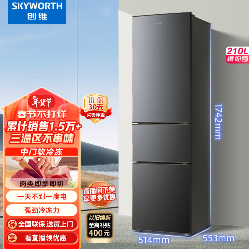 创维 (SKYWORTH)210升小冰箱 三门家用小型电冰箱 三门三温区中门软冷冻 保鲜省电低音P21TJ价格:899.00元!