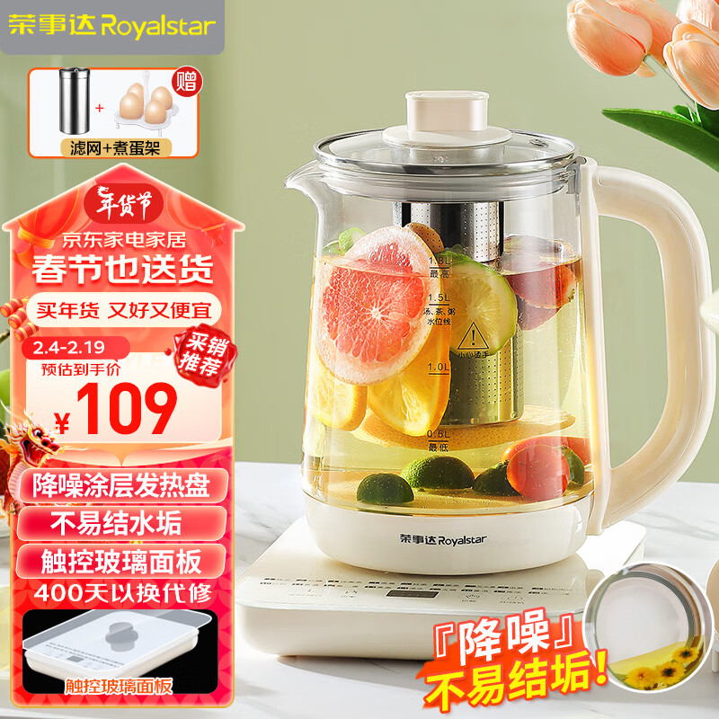 荣事达(Royalstar)养生壶1.8L大容量电热水壶电水壶家用办公室智能预约陶瓷釉不粘底煮茶器花茶壶 带滤网 YSH180Z(L)价格:109.00元!