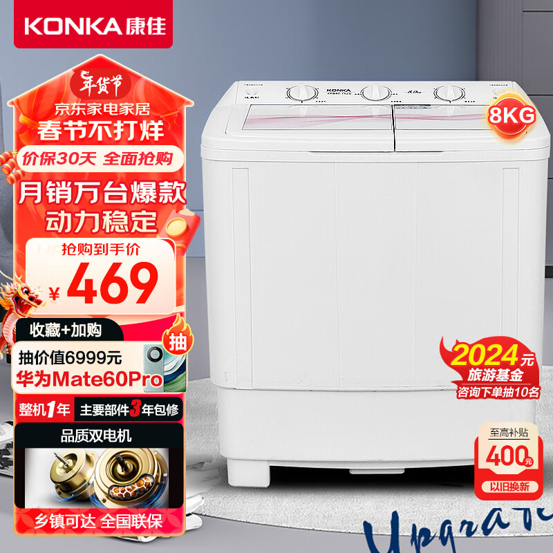 康佳(KONKA)8公斤 半自动波轮洗衣机 大容量 双桶双缸 脱水甩干机 家电(白色)XPB80-752S价格:469.00元!