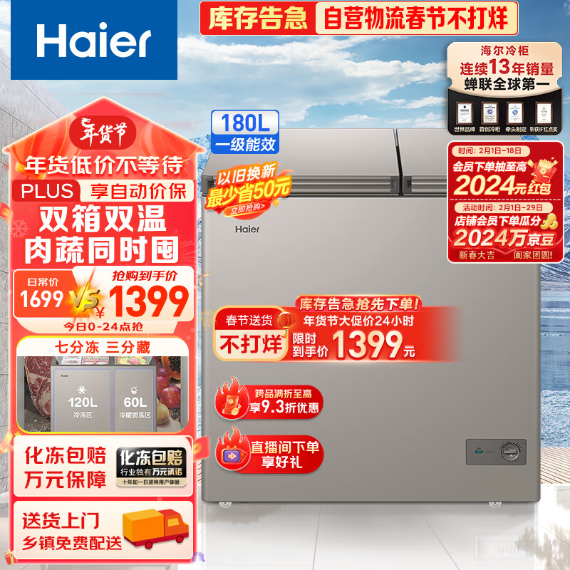 海尔(Haier)180升低霜双箱双温商用家用冰柜 大冷冻小冷藏卧式冰柜家用小型FCD-180GHXCD 以旧换新价格:1399.00元!