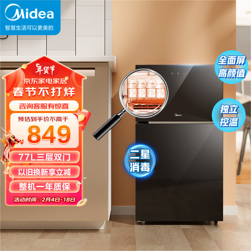 美的(Midea)消毒柜家用 立式 厨房餐具碗柜碗筷茶杯茶具 77L三层双门 小型智能 高温 二 XC60价格:849.00元!