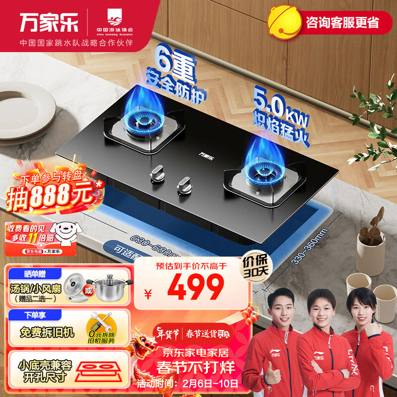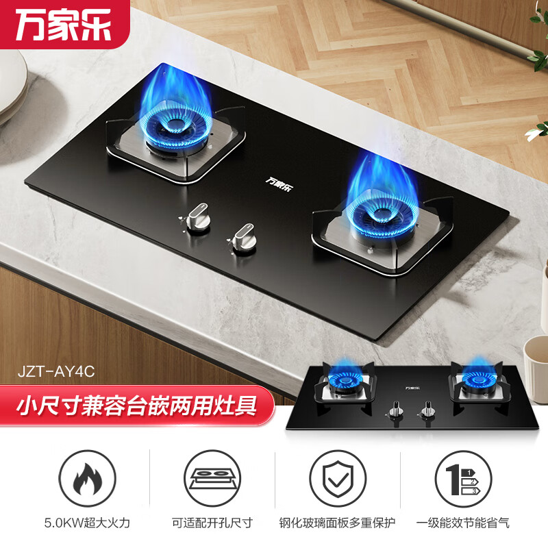 万家乐燃气灶 5.0kw大火力 台式嵌入式两用燃气灶双灶 可适配开孔尺寸 钢化玻璃全进风天然气灶JZT-AY4C价格:598.00元!