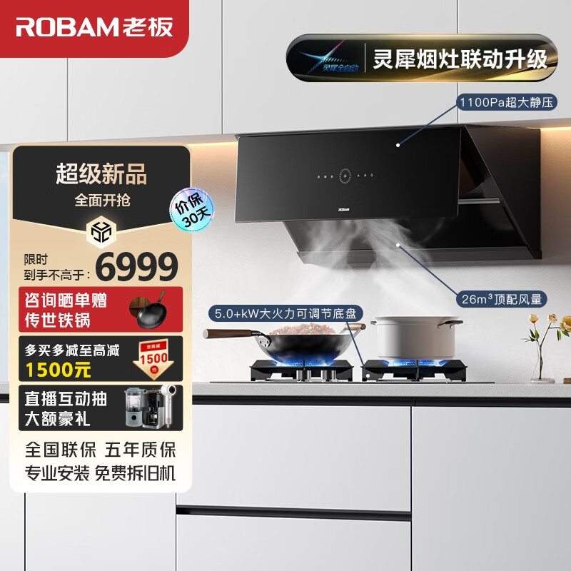 老板(Robam)抽油烟机智能变频灵犀全自动控烟家用侧吸26风量吸烟机燃气灶具烟灶套装29A9S+57B2D套装(天然气)价格:6999.00元!