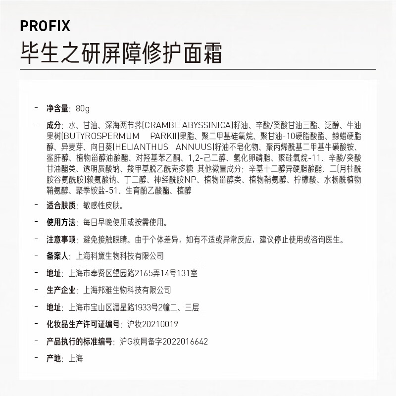 毕生之研屏障修护厚脸皮霜80g补水保湿淡红面霜敏感肌护肤特护霜价格:279.00元!