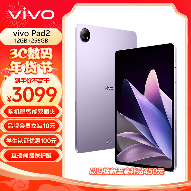 vivo Pad2 12.1英寸平板电脑(天玑9000旗舰芯片 12GB+256GB 144Hz超感原色屏 10000mAh电池)星云紫价格:3099.00元!