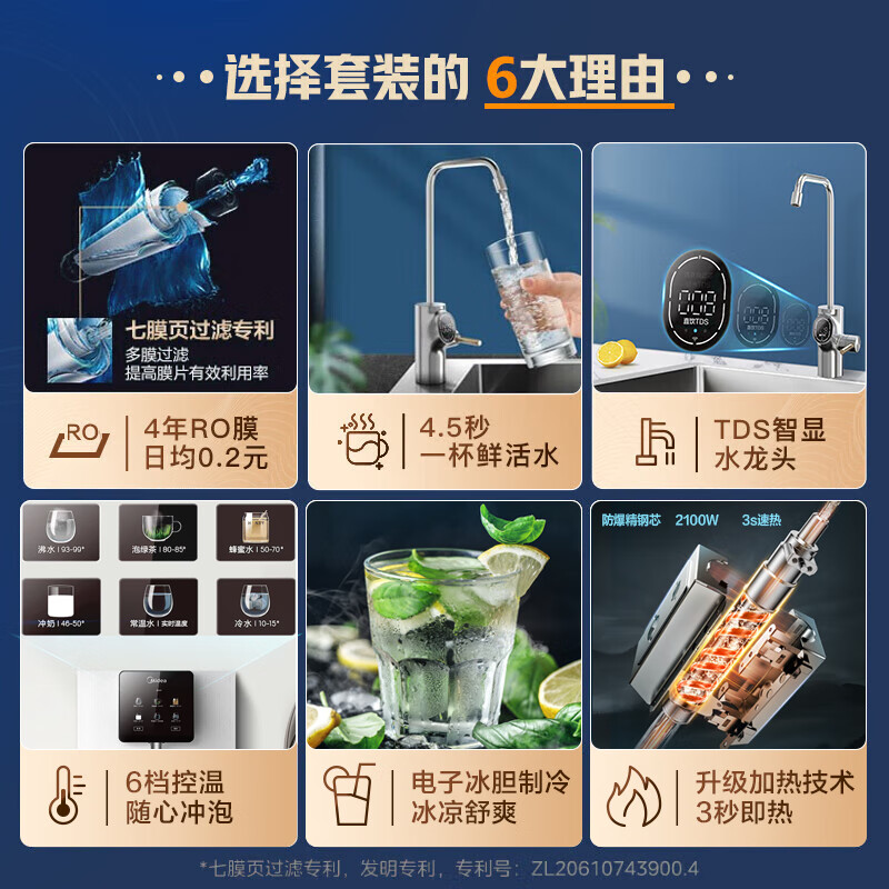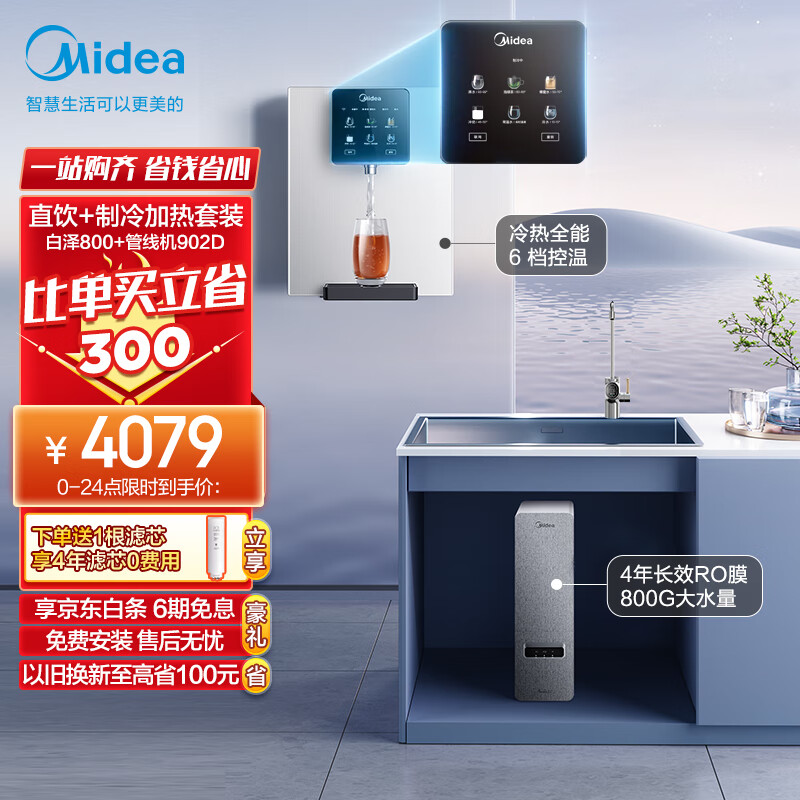 美的(Midea)直饮冷热净水器套装【白泽800G+管线机902D】厨下RO反渗透 家用壁挂式即热一体净饮机价格:4079.00元!
