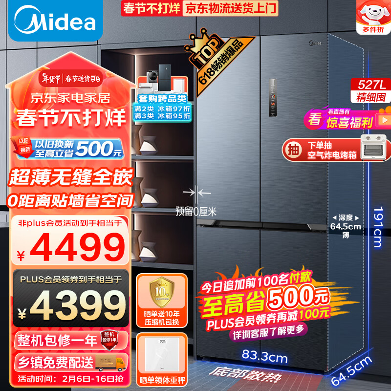 美的(Midea)无缝全嵌系列十字双开门四开门超薄零嵌入式大容量家用智能变频电冰箱一级能效保鲜MR-553WUSPZE价格:5499.00元!