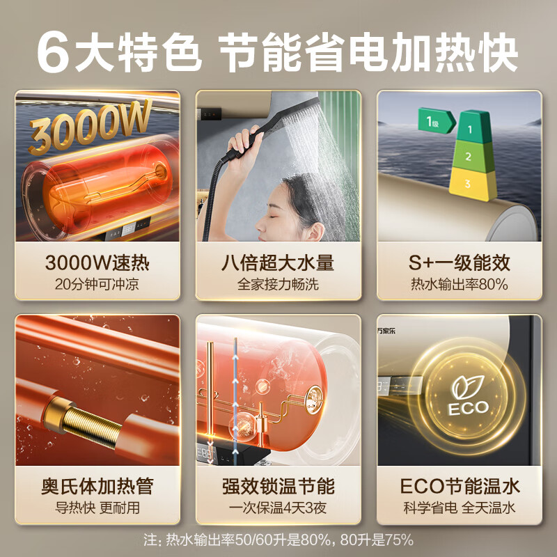 万家乐80升电热水器3000W速热大水量 一级能效 双重防电 高温杀菌 搪瓷内胆 香槟金D80-FY2价格:829.00元!