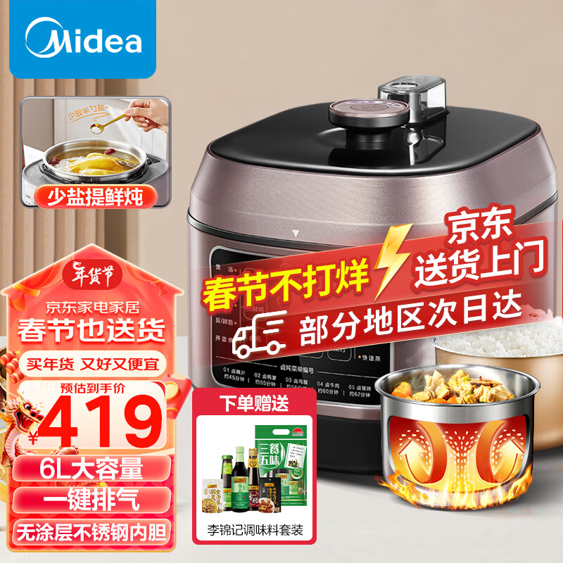 美的(Midea)少盐系列 6L大容量家用智能电锅 提鲜祛腥精钢内胆开盖收汁电高压锅MY-C640G(2-12人食用)价格:479.00元!