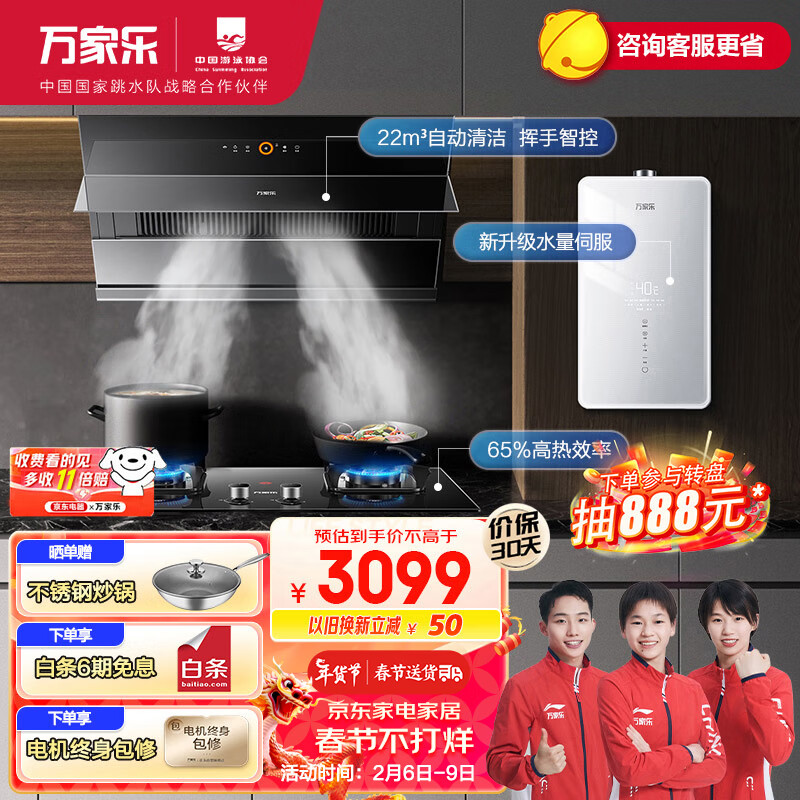 万家乐烟灶热水器三件套 22立方挥手烟灶16L水伺服天燃气热水器厨房套装AL061+KV061B+16T8天然气价格:3299.00元!