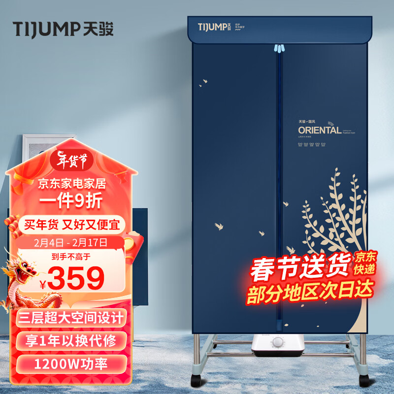天骏小天使(TIJUMP)烘干机 干衣机家用衣服烘衣机风干机高温除菌?容量15KG?功率1200W?不锈钢三层TJ-J201P价格:399.00元!