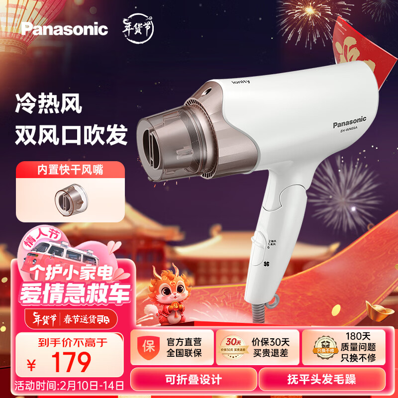 松下(Panasonic)电吹风机大功率高速大风力速干外出家用折叠便携送老婆负离子护发电吹风筒EH-WNE6A价格:179.00元!