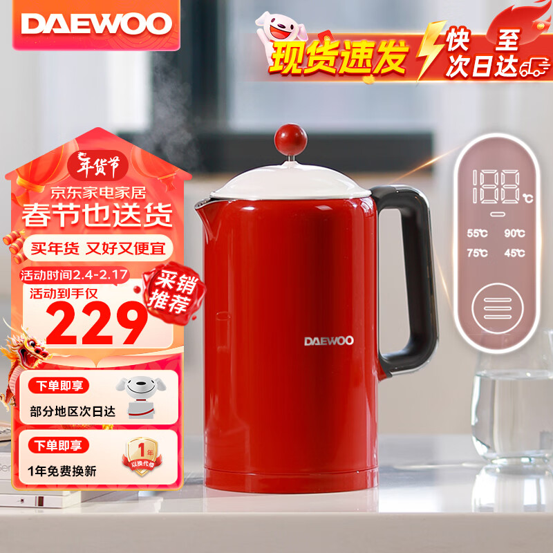 大宇(DAEWOO)复古电热水壶 恒温水壶家用电烧水壶热水壶 保温调温泡奶不锈钢1.5L大容量年货送礼EK01红色电子款价格:259.00元!