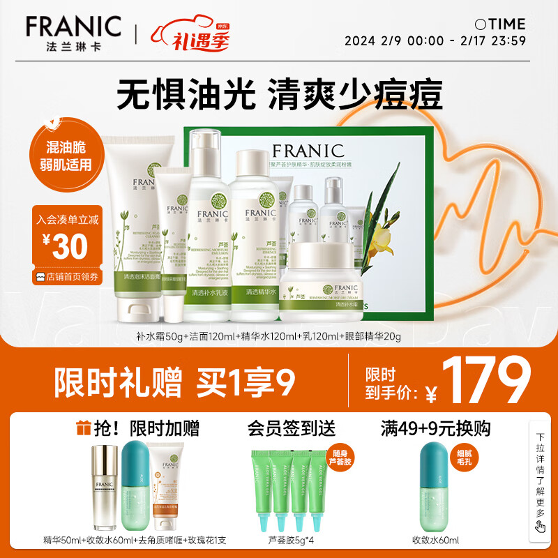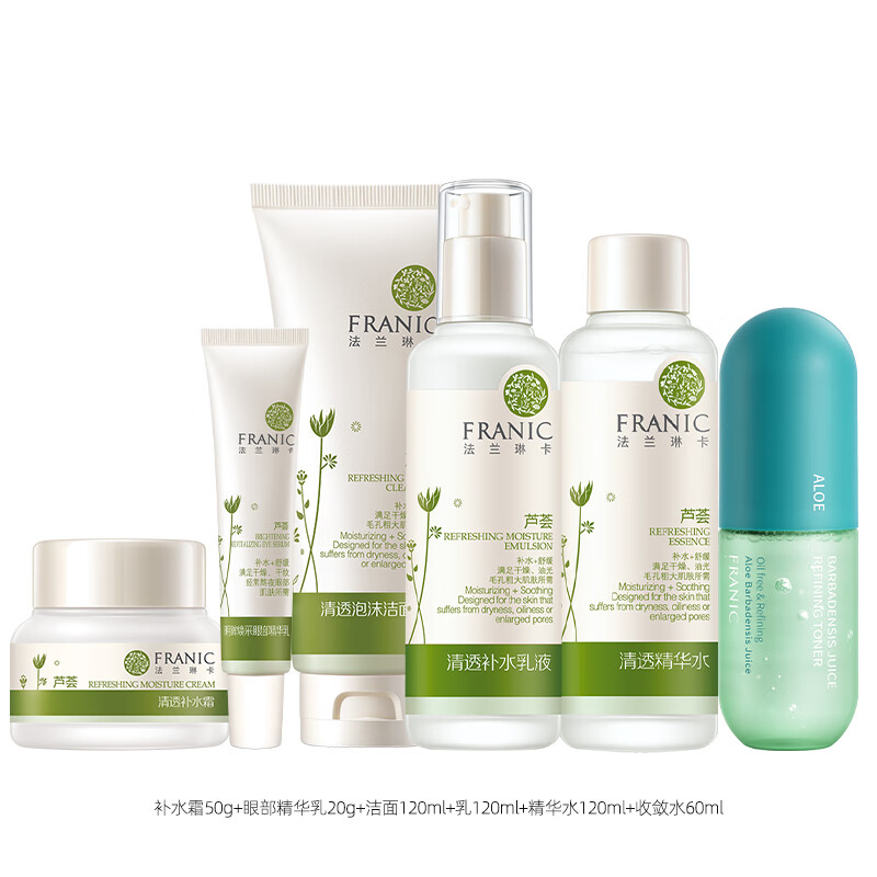 法兰琳卡(FRANIC)护肤品套装护肤礼盒 芦荟清透补水控油收缩毛孔水乳化妆品7件套价格:179.00元!