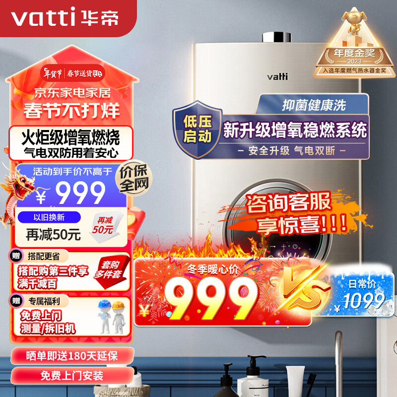 华帝(VATTI)12升燃气热水器天然气节能省气智能恒温气电双断多重防冻低水压启动金色家用i12104-12价格:1199.00元!