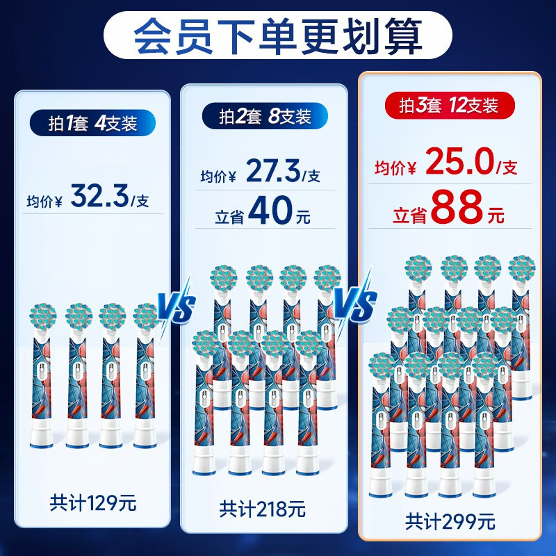 欧乐B儿童电动牙刷头4支装适用D103KD100KPro1kids蜘蛛侠EB10/EB10S-4K德国进口软毛(图案包装随机发)价格:129.00元!