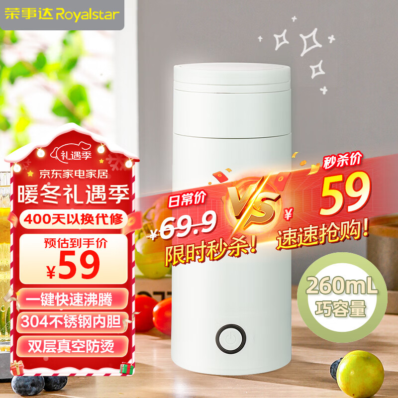 荣事达(Royalstar) 电热水杯便携式烧水壶旅行烧水杯出差电热水壶办公室电炖杯迷你烧水壶冲奶电热杯 机械款RS-CP03B价格:65.90元!