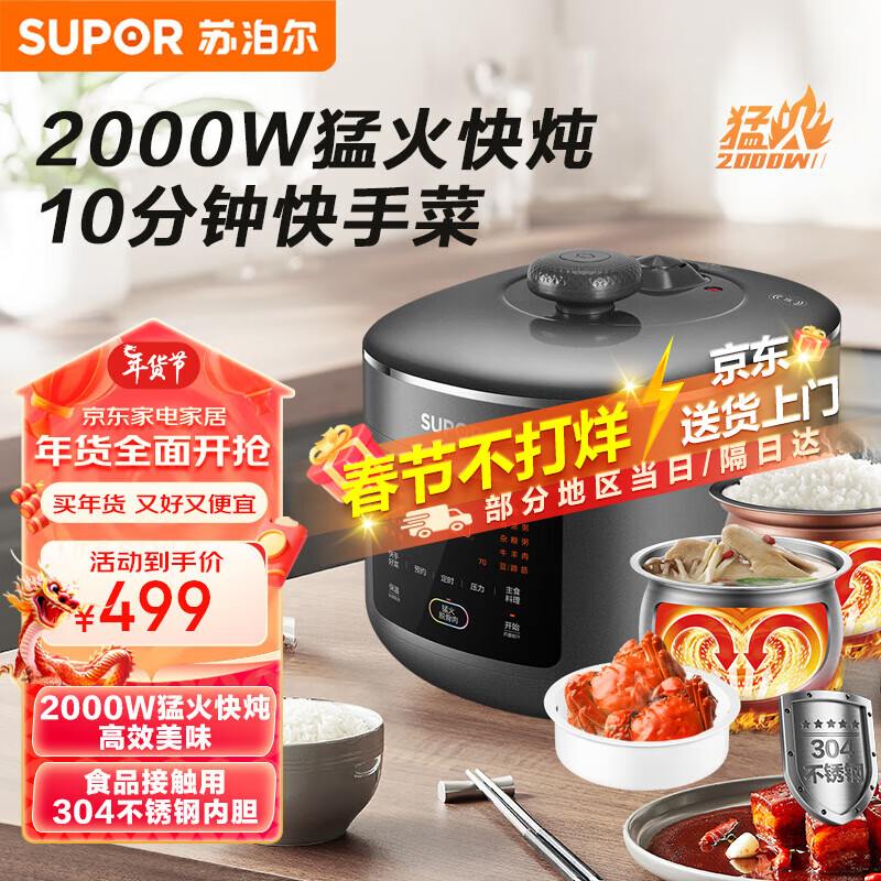 苏泊尔(SUPOR)猛火系列电锅5L家用 智能预约10min菜2000W煲汤不锈钢球釜SY-50FC5009Q双胆高压锅3-6人价格:689.00元!