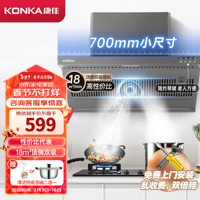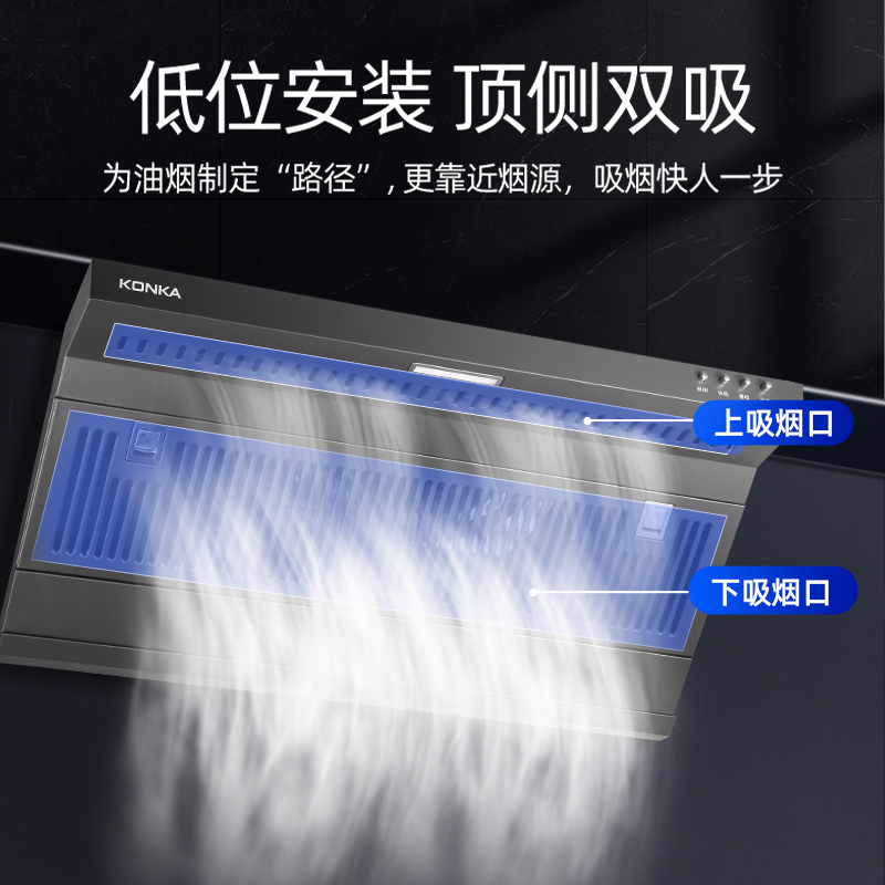 康佳(KONKA)抽油烟机顶侧双吸 经典侧吸式 家用18m3/min爆炒大吸力700mm小户型优选油烟机 CXW-288-KJ57S价格:599.00元!
