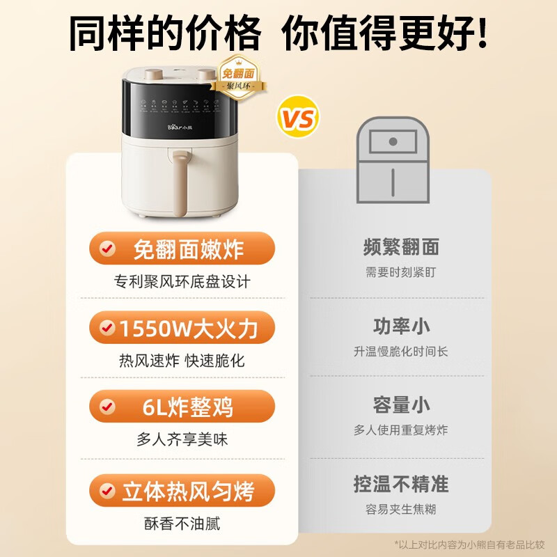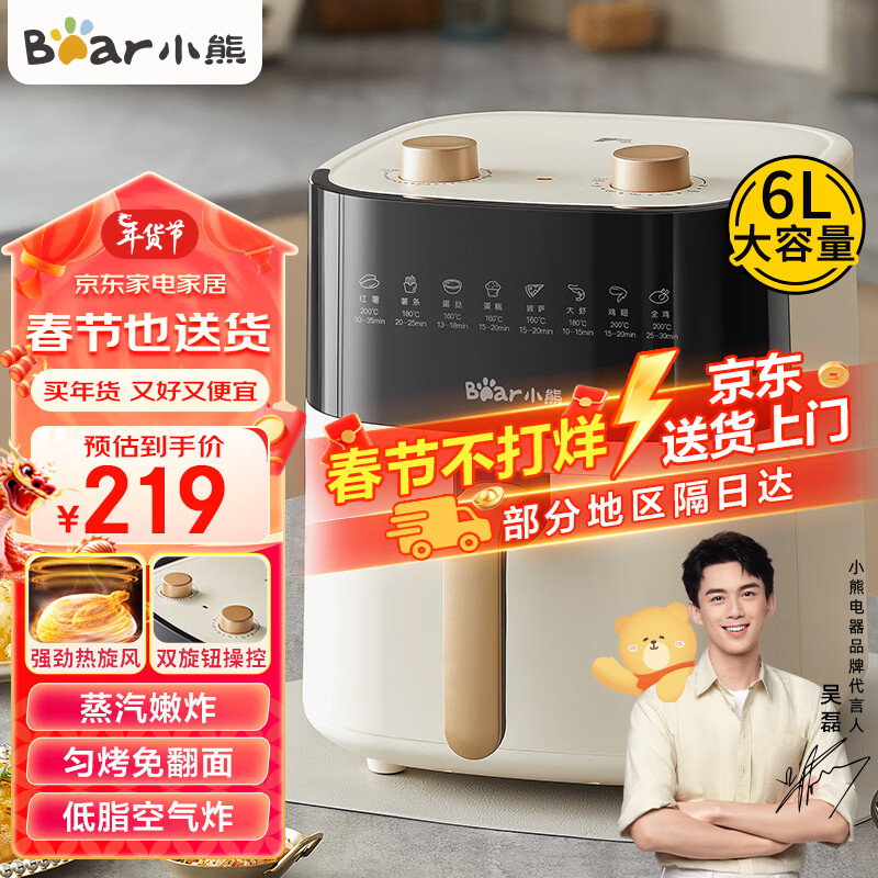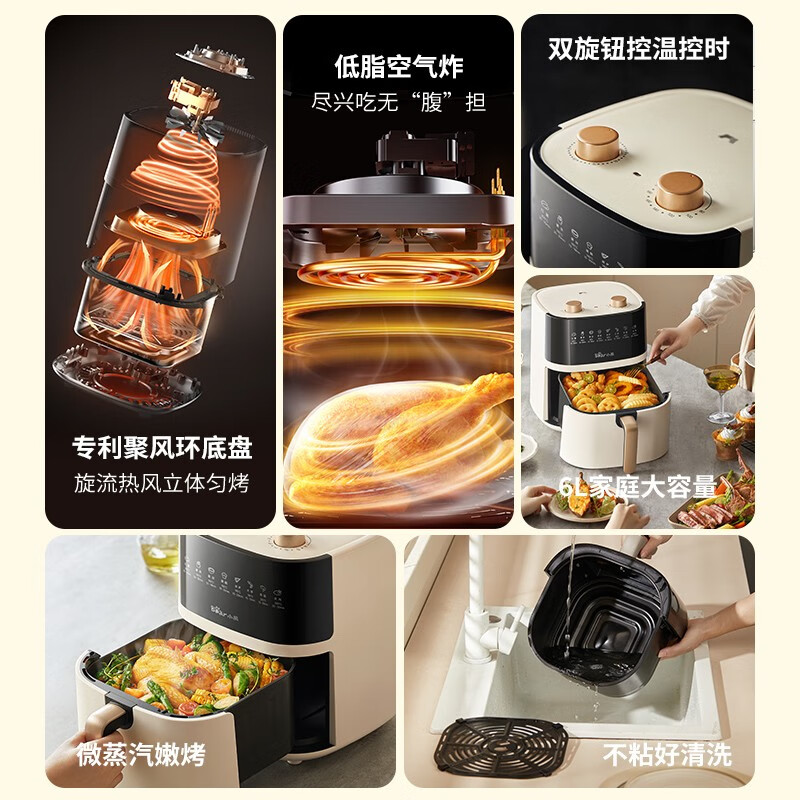小熊(Bear)空气炸锅 不用翻面 6L大容量 不沾易清洗 精准控温 轻脂 低油煎炸 炸烤箱一体 QZG-E16E5价格:239.00元!
