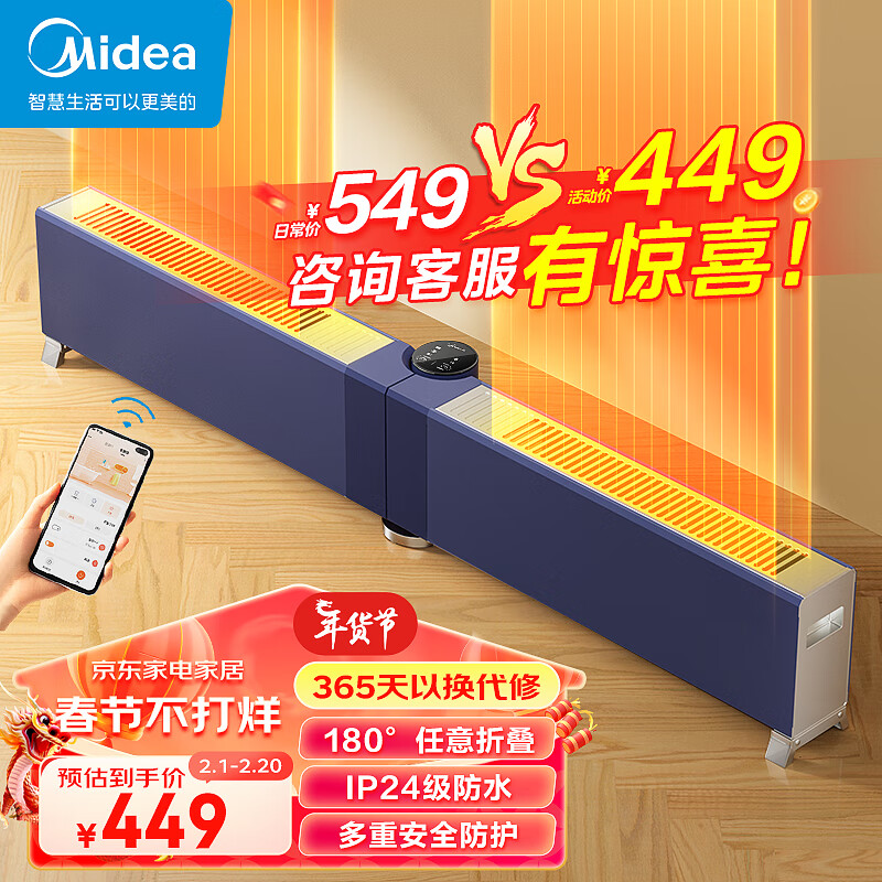 美的(Midea)1.27米可折叠石墨烯取暖器/电暖器/电暖气家用/WIFI智能/移动地暖/踢脚线浴室除菌 HDW22EVA价格:720.00元!