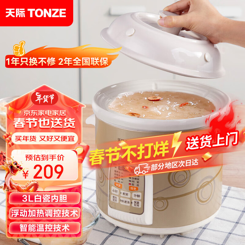 天际(TONZE)电炖锅 电炖盅 煲汤锅炖汤锅 婴儿煮粥锅 熬粥养生锅 快速焖炖 直炖白瓷胆 DGD30-30CWD 3升价格:209.00元!