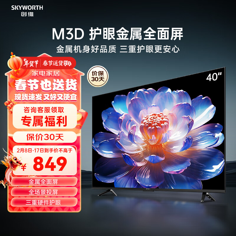 创维电视40M3D 40英寸高清 护眼金属屏智能投屏电视机 1+8G内存 三重硬件护眼40A3D 40英寸护眼电视价格:849.00元!