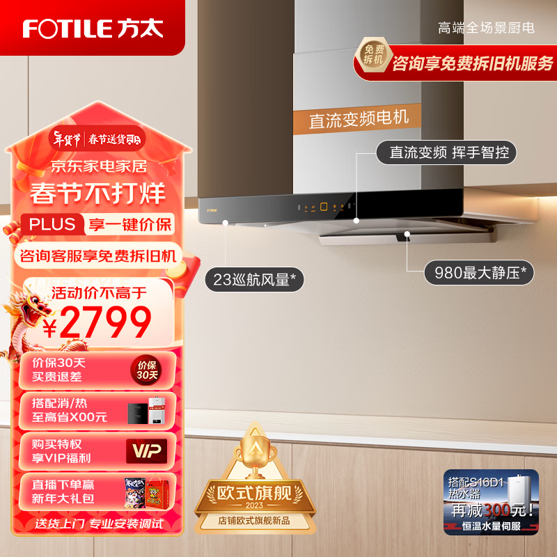 方太(FOTILE)欧式顶吸抽吸油烟机 家用厨房 23m3/min超大吸力 挥手智控 直流变频 单烟机02-EMD22T价格:2799.00元!