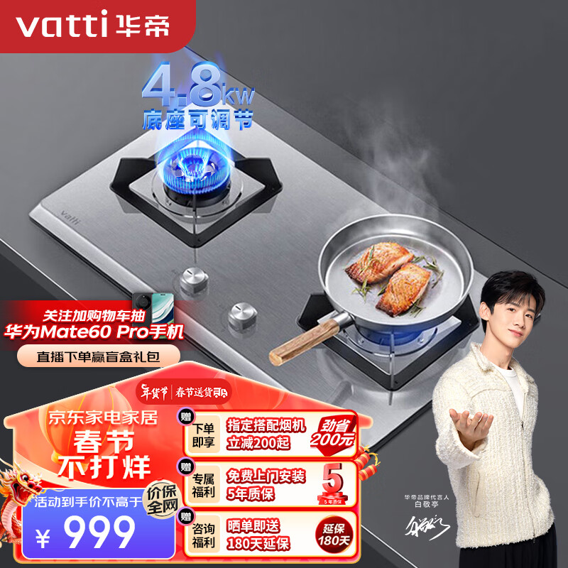 华帝(VATTI)燃气灶家用嵌入式 4.8kW高热效易打理不锈钢面板换灶不改孔燃气灶具灶台JZT-i10064A(天然气)价格:999.00元!