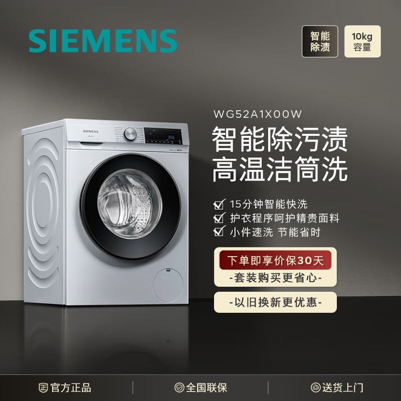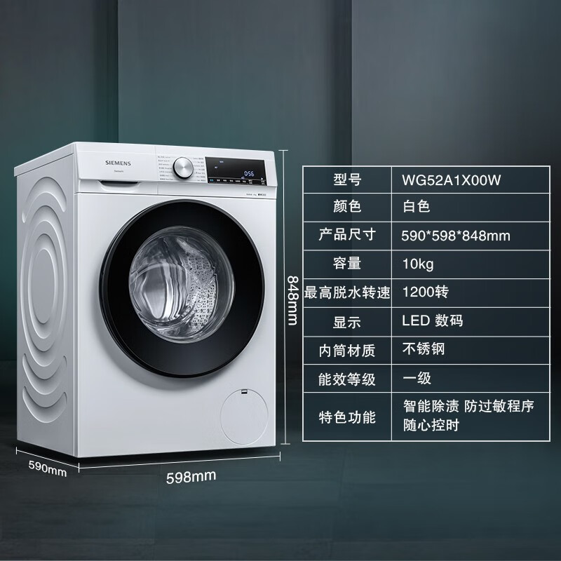 西门子(SIEMENS) 10公斤滚筒洗衣机全自动 BLDC变频电机 智能除污渍 专业羽绒洗 XQG100-WG52A1X00W价格:4099.00元!