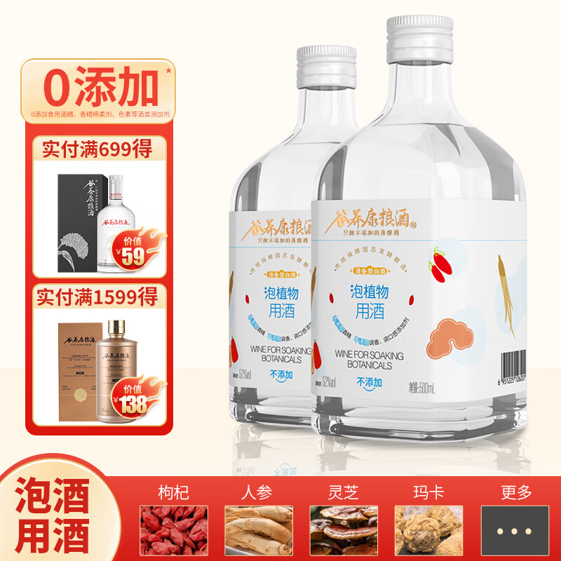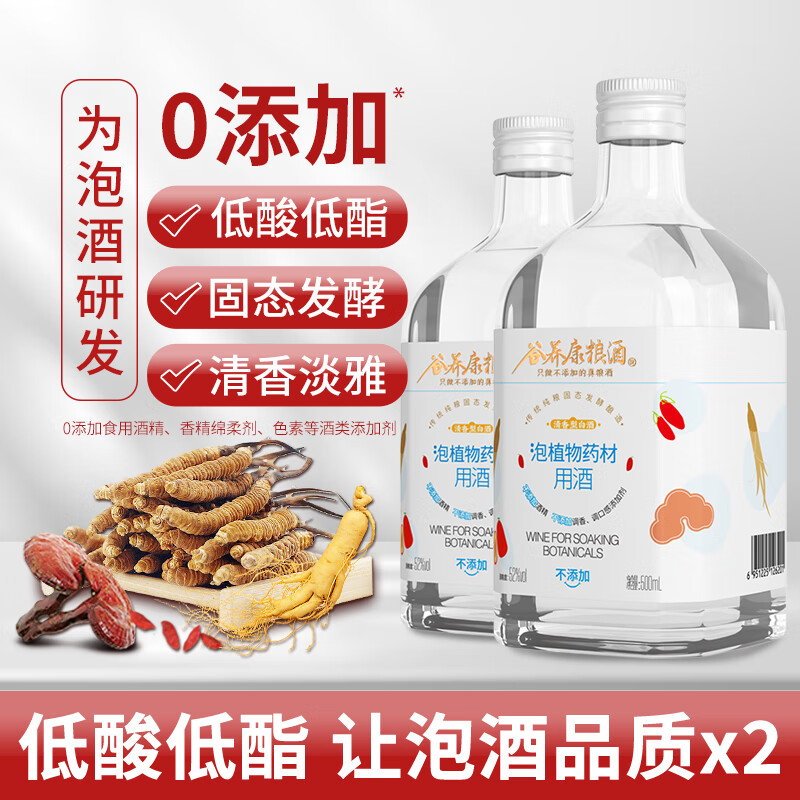 谷养康粮食酒 泡酒用酒瓶装清香高粱酒白酒泡果酒泡药酒纯粮酒 52度 500mL 2瓶 【适合植物类】价格:89.00元!