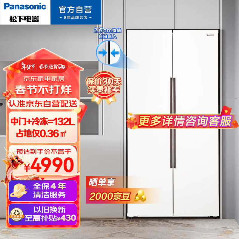 松下(Panasonic)570升家用对开门冰箱 自由嵌入式 超薄大容量双开门 冷冻王冰箱 磨砂白色NR-JB57WPA-W价格:4990.00元!